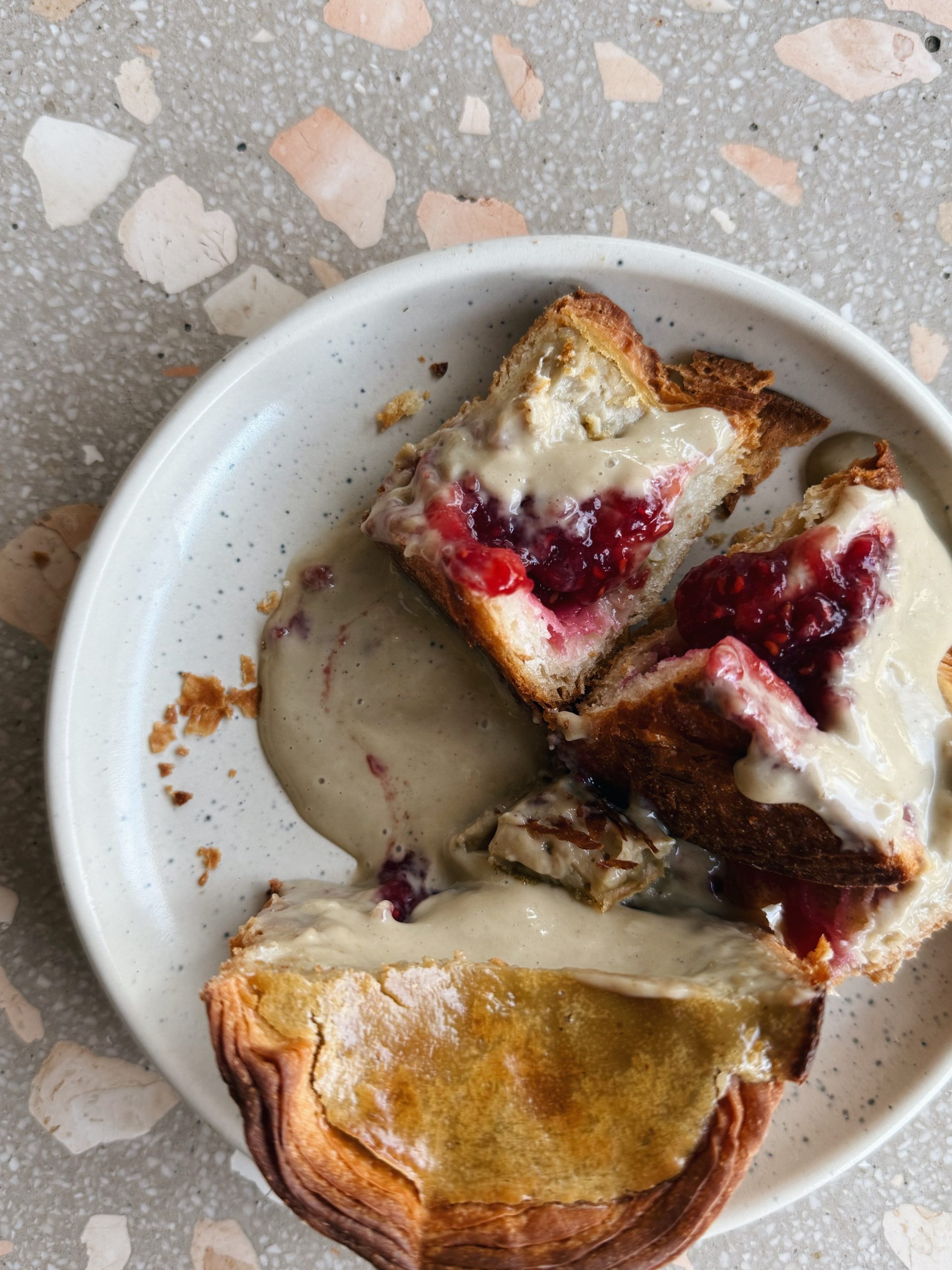 Ciasto francuskie wypełnione kremem pistacjowym i konfiturą malinową.