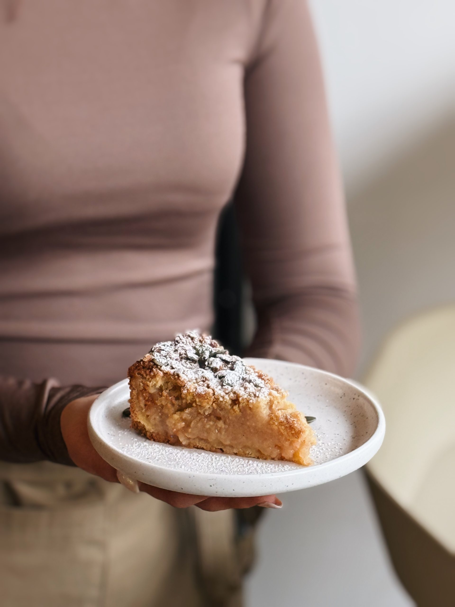 Kruche, orkiszowe ciasto, a w środku jabłka odmiany szara reneta, uprażone na maśle, z dodatkiem cynamonu i wanilii.